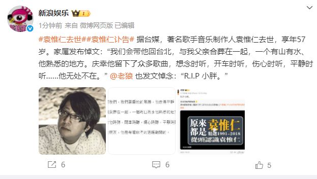 袁惟仁去世,享年57岁 微博截图