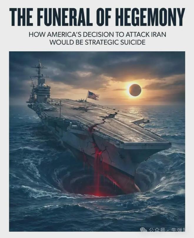 我看到,还有海报展示美国航母被摧毁的场景,文章的标题则是:“霸权的葬礼,美国决定攻击伊朗将是一场战略自杀”。