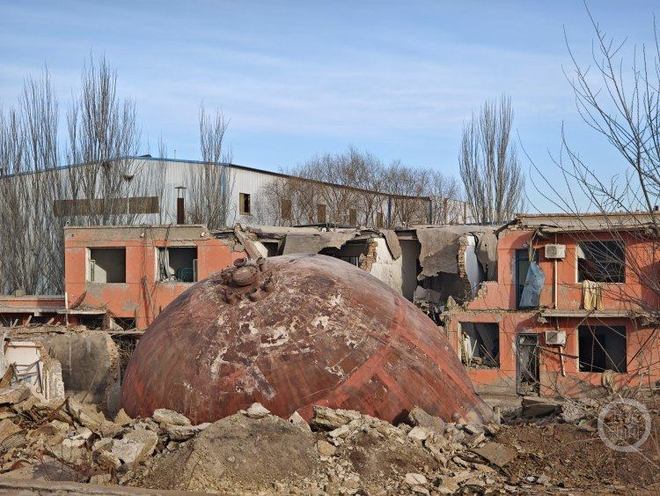 19日上午,上游新闻记者在爆炸工厂附近的尔甲亥村一家饭店后院的屋顶上,看到一个直径数米的巨型球状物体落在村里一座房屋的废墟中,记者打开导航软件,显示此处距离发生爆炸的厂区直线距离已有数公里。