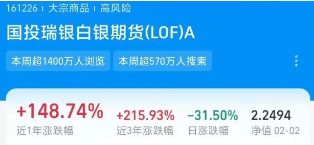 自去年以来,国际市场上白银等贵金属价格持续走高。在此背景下,作为国内唯一一只跟踪白银期货的场内基金——国投瑞银白银期货LOF也吸引了许多投资者。但2月2日,国投瑞银白银LOF在更新净值后,从上一交易日的3.2838元“跳水”至2.2494元,单日跌幅达31.5%。
