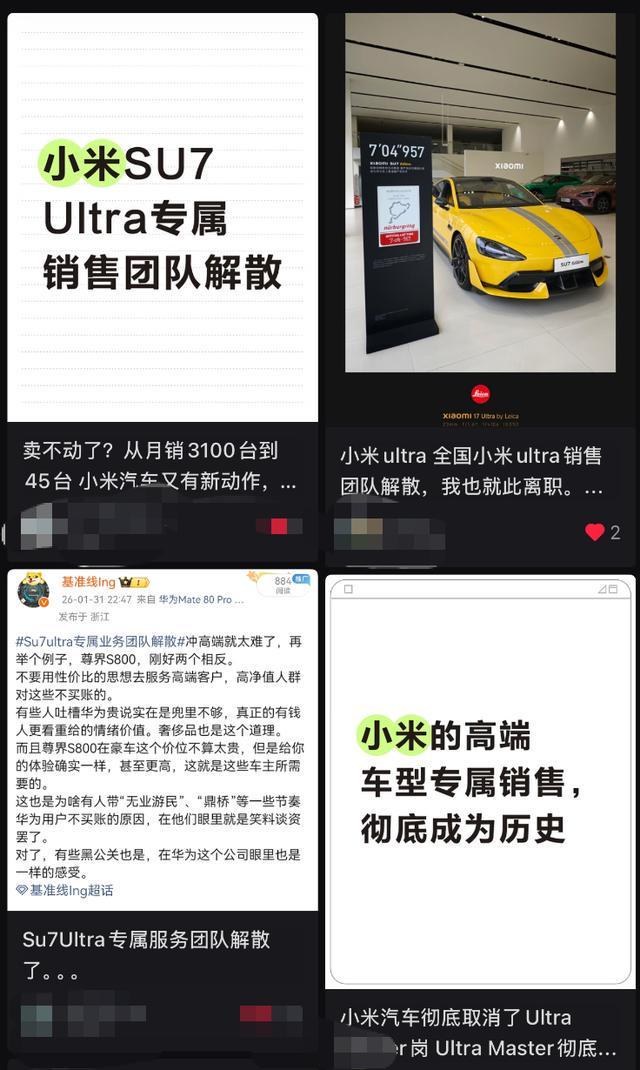 近日,多名小米汽车销售在社交平台发帖称,SU7 Ultra该款车型的专属销售团队已经解散。