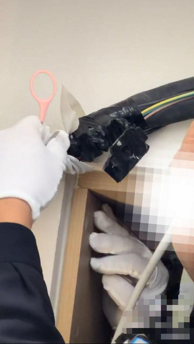 视频显示,民警到房间后,对空调管道进行了拆除,确认一个摄像头就藏在其中。