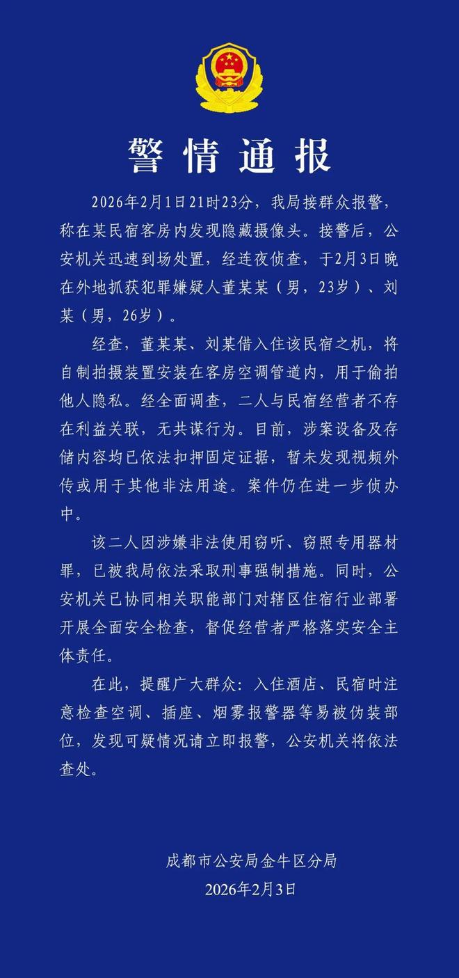成都市公安局金牛区分局于2月3日晚就此事发布了警情通报称,2026年2月1日21时23分,该局接群众报警,称在某民宿客房内发现隐藏摄像头。接警后,公安机关迅速到场处置,经连夜侦查,于2月3日晚在外地抓获犯罪嫌疑人董某某(男,23岁),刘某(男,26岁)。
