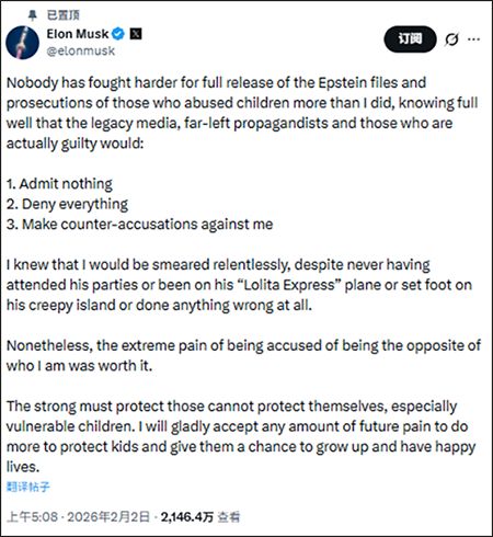 而被曝曾与爱泼斯坦讨论“上岛”的马斯克这两天在X平台上也再次回应此事。他称:“没有人比我更努力推动全面公开爱泼斯坦案文件、并追究那些虐待儿童者的法律责任。我很清楚,这样做必然会招致传统媒体、极左翼宣传者以及那些真正有罪的人的反击。”